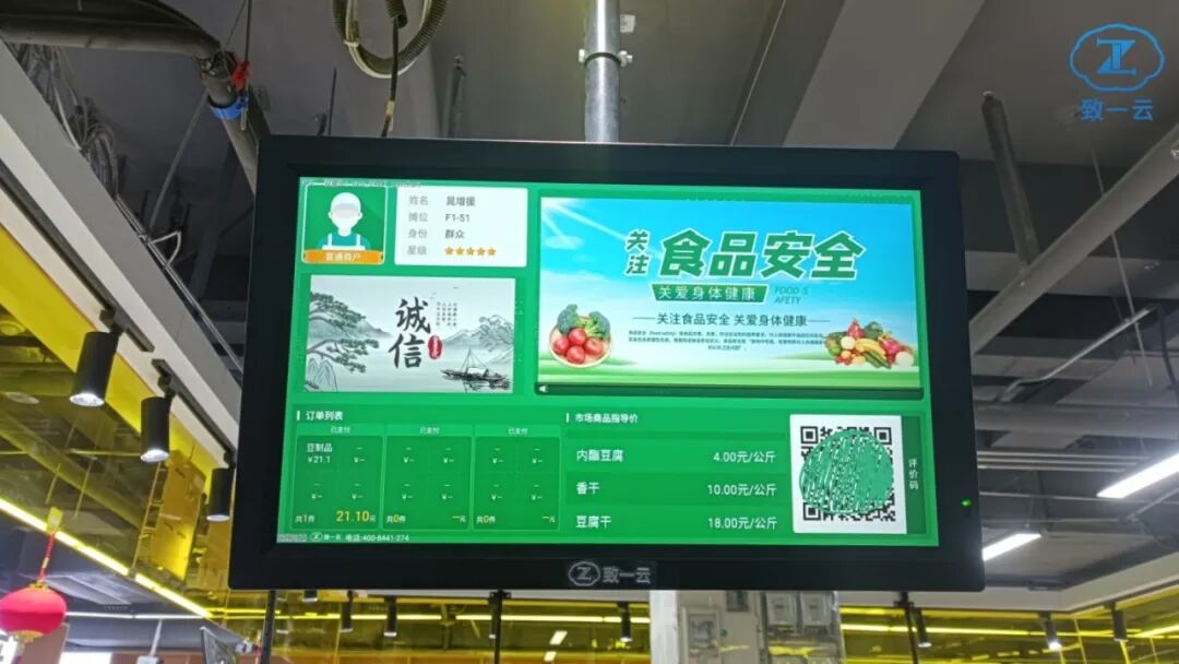 市场内的大数据屏实时滚动着指导菜价、客流量、交易量等数据,为市场提供一个展示端口。市场数据的可视化呈现离不开市场与致一云合作使用的“智慧农贸管理系统”,该系统结合场内溯源电子秤、商户屏、食品安全检测仪等智慧硬件设备,帮助市场更直观地实时监控与统计买卖行为、快速了解市场各维度数据、协助市场方更高效地对市场进行管理。